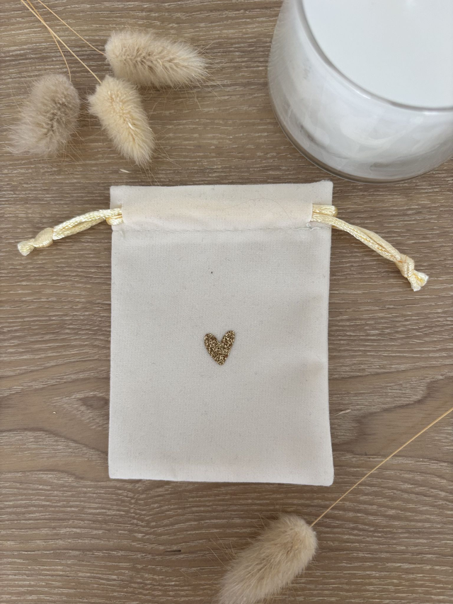 Le petit pochon en velours avec cordon de serrage et motif coeur doré permettra d'y glisser à l'intérieur vos broches.