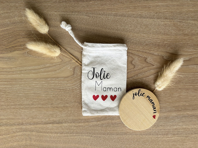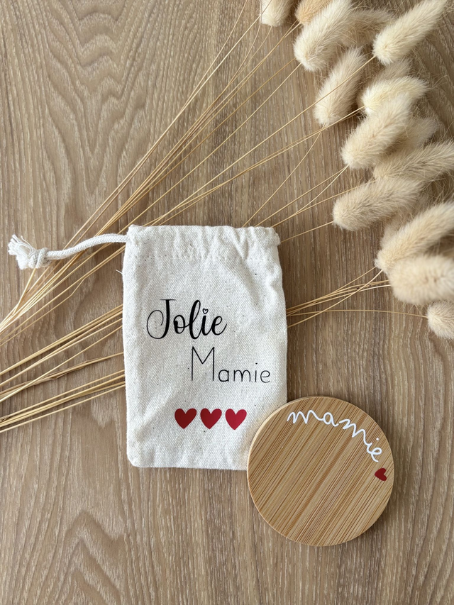 Miroir de poche en bois au design arrondi, accompagné d'une pochette en coton avec un cordon de serrage facilitant son transport.