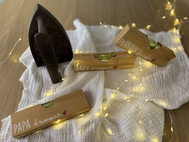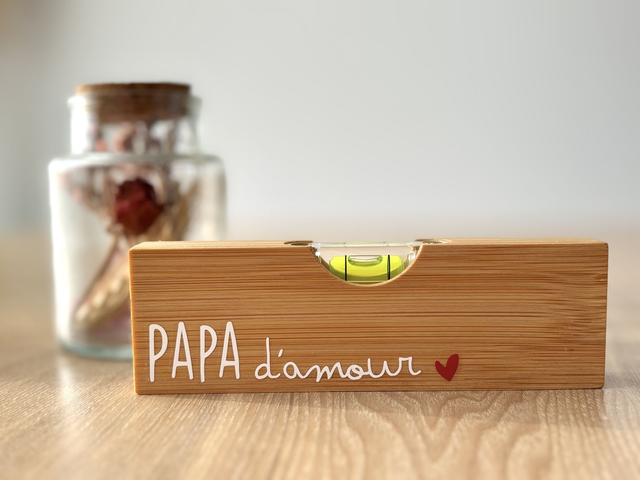 Niveau en bois, équipé d'un ouvre bouteille en métal au dos.