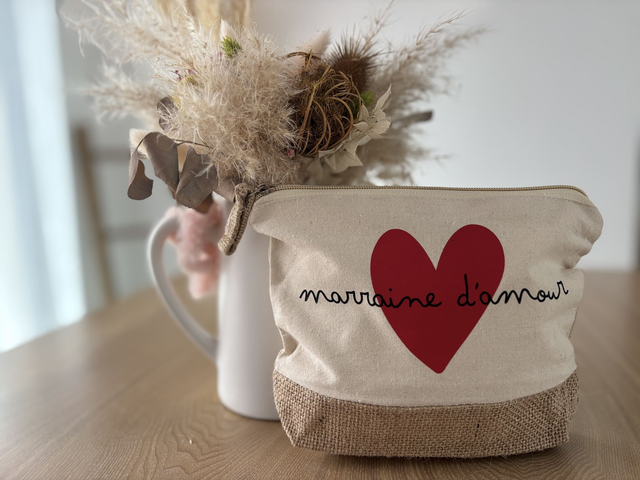 Pochette en tissus alliant coton et jute laminé avec fermeture éclair.